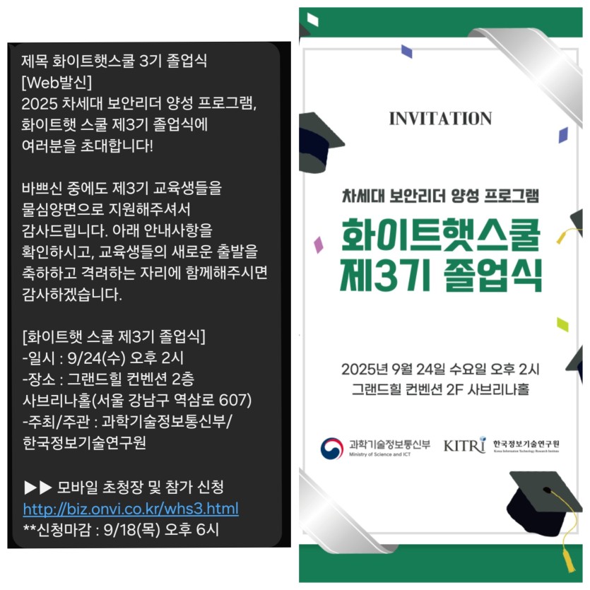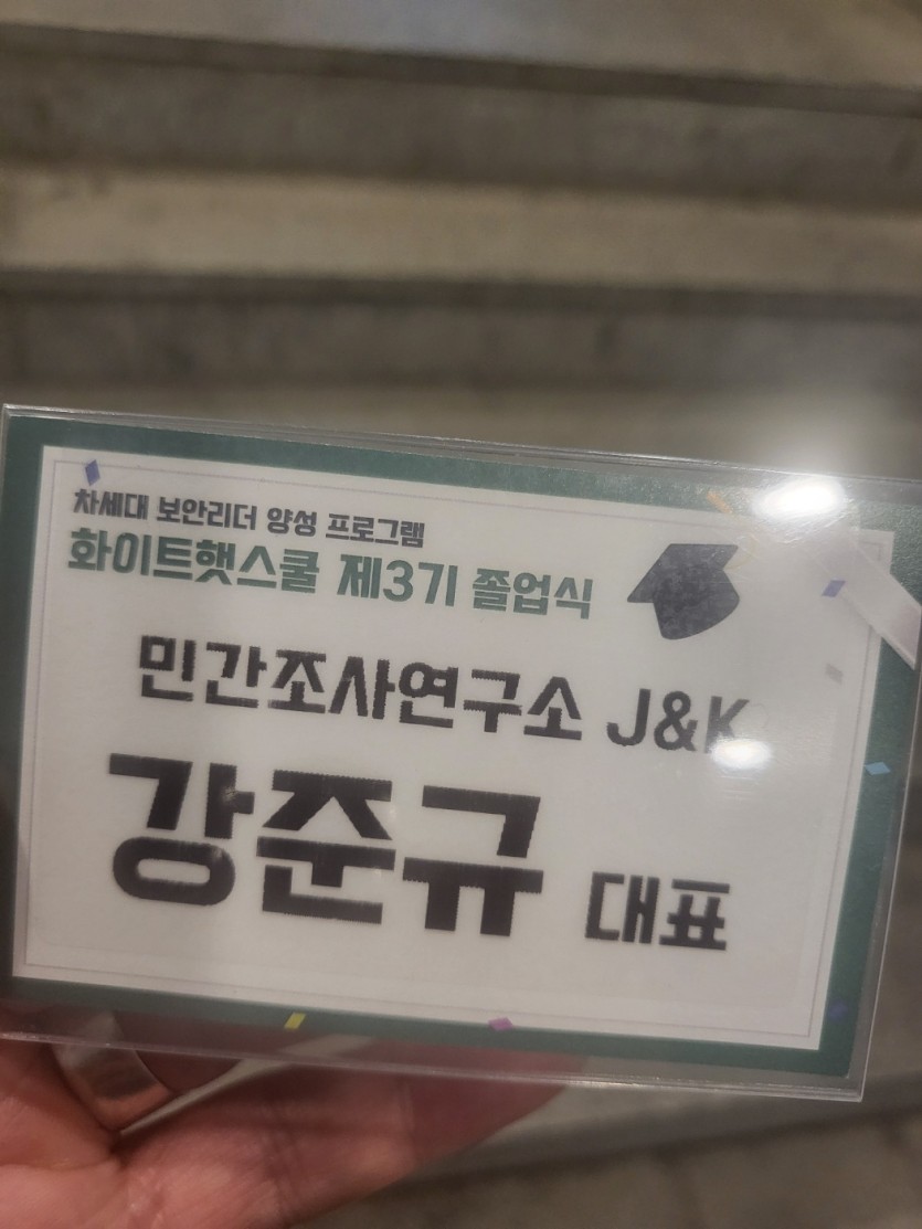 평소와 다름없는 어느 날, 제이앤케이 민간조사연구소에 ‘화이트햇스쿨 제3기 졸업식’ 초청장이 도착하였습니다. 국내 최고의 화이트 해커와 차세대 보안 리더를 양성하는 기관에서, 국정원 출신이 이끄는 제이앤케이 민간조사연구소를 공식 행사에 초대한 것입니다.
